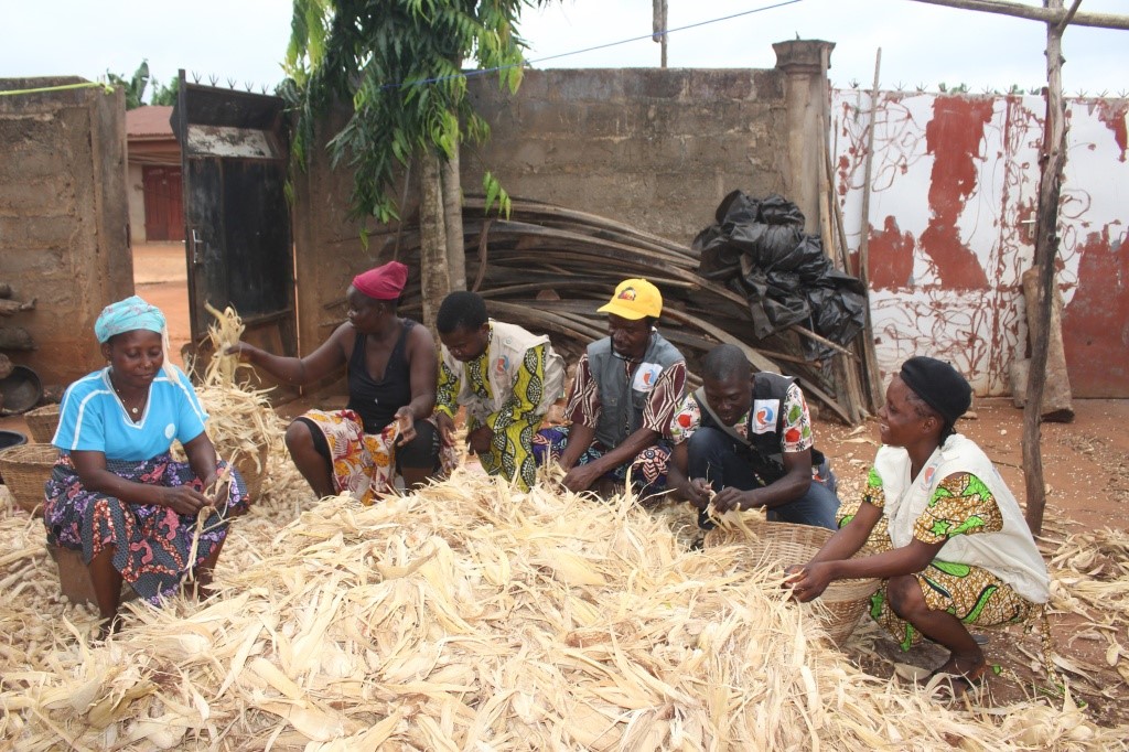Ce travail a permis aux participant.e.s de solliciter leur ingéniosité, leur sens de créativité, pour passer au peigne fin à travers des toiles  dessinées et peintes différentes thématiques à savoir la production de manioc, la transformation, la cuisson et la gestion des déchets qui en découlent.